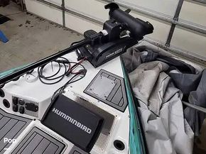 The large forward casting platform includes the 112 lb. thrust Minn Kota Terrova trolling motor with remote control and recessed in deck pedal controller which with the 9-inch Humminbird Helix with down imaging GPS gives you extraordinary fishing advantage. A larger center rod box has four rows to store your 9-foot maximum length rods with access to the trolling motor battery storage. Starboard and port side have additional storage and a built-in cooler storage and a 19-quart Engel cooler and a third cooler serves also as the step to the forward deck